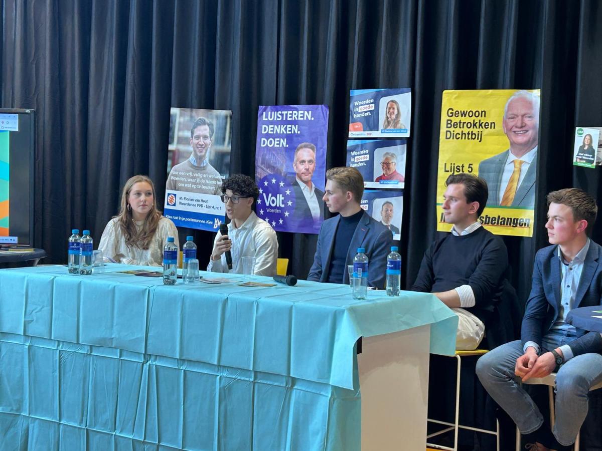 Op het podium stonden vijf jonge kandidaten die zich verkiesbaar hebben gesteld voor de gemeenteraad van Woerden. Nadir Ben Ali (16 jaar), leerling van het Minkema College en nummer 10 op de lijst van Progressief Woerden, ging de discussie aan met Charlotte Bolk (18 jaar, nr. 8) van D66, oud-leerling Florian van Hout (VVD, plek 5), Ivo van der Tol (21 jaar, plek 3) van het CDA en Joël de Wit (19 jaar, plek 5) van de CU/SGP.