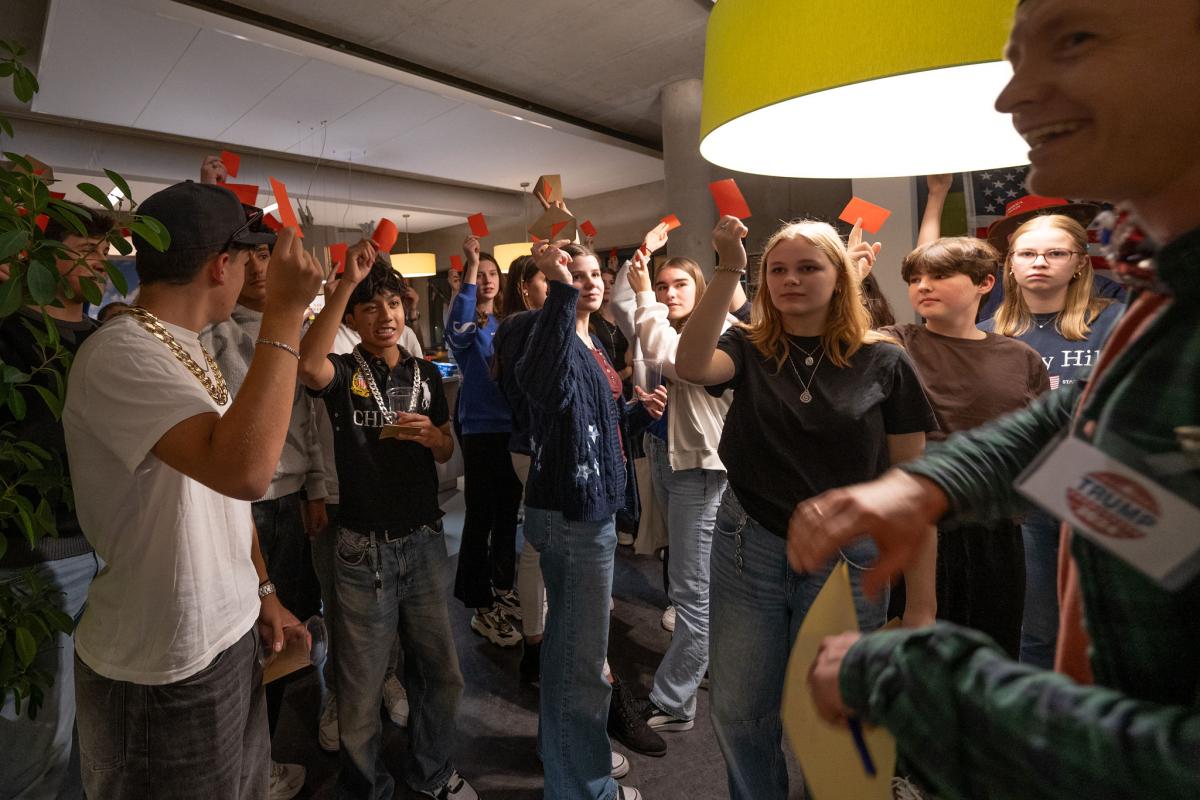 Het maximaal aantal aanmeldingen voor deze bijzondere avond was in slechts één ochtend bereikt en dat zegt veel over de internationale politieke interesse van deze leerlingen. Uitgedost als Harris- of Trump-aanhangers en met volgeladen tassen (veelal zelf gebakken) Amerikaanse snacks stroomde de personeelskamer van het Minkema vol met bovenbouwleerlingen.