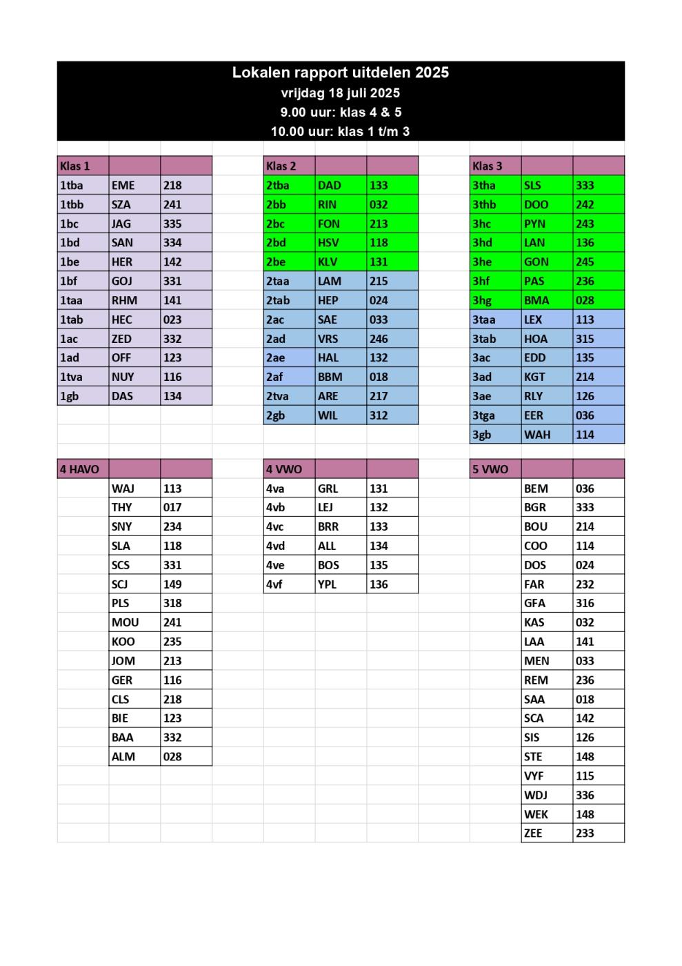 Elke klas gaat naar het lokaal van zijn mentor. Daar krijgt iedereen zijn laatste rapport van dit schooljaar uitgereikt. Er zijn twee tijdsloten: Klas 4 & 5 om 9.00 uur. Klas 1 t/m 3 om 10.00 uur.