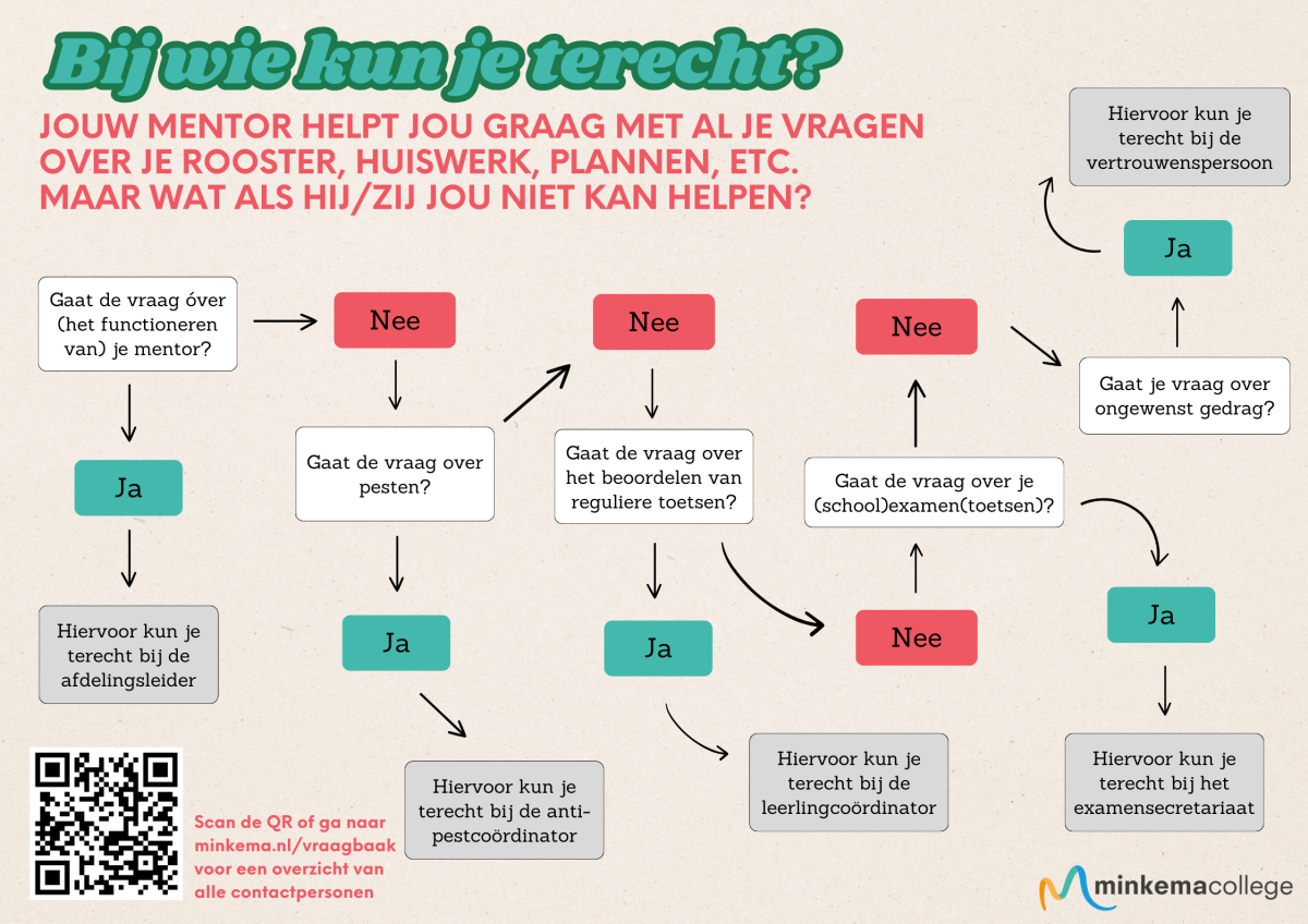 We hebben hieronder inzichtelijk gemaakt waar jij en jouw ouders terecht kunnen met vragen, problemen en zorgen. In nagenoeg alle gevallen is de mentor de eerst aangewezen persoon.